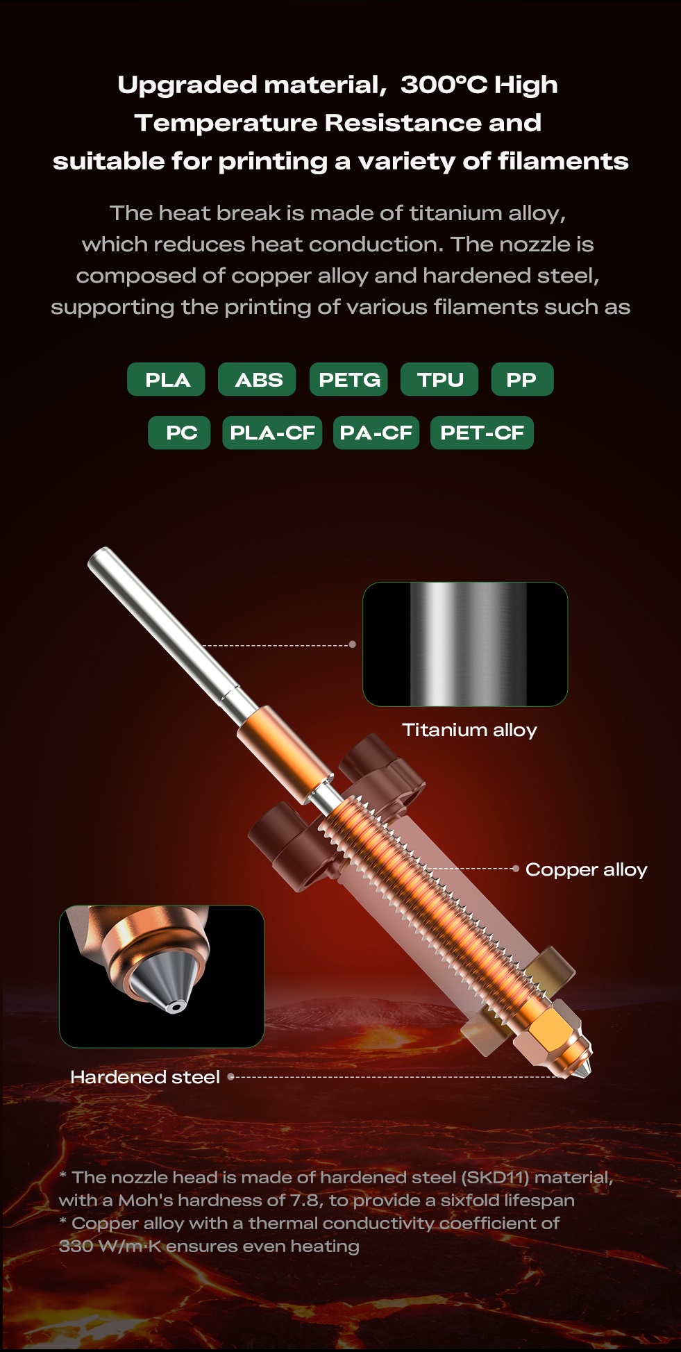 - Upgraded material withstands temperatures up to 300°C and is suitable for printing a variety of filaments.